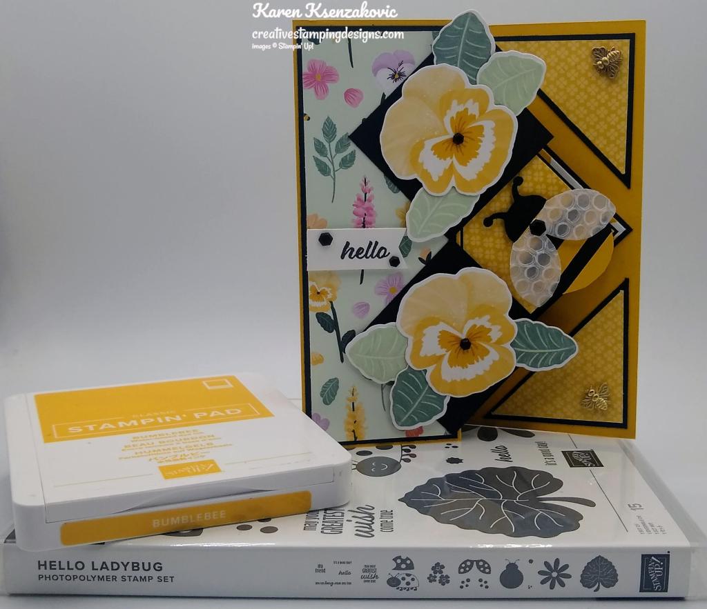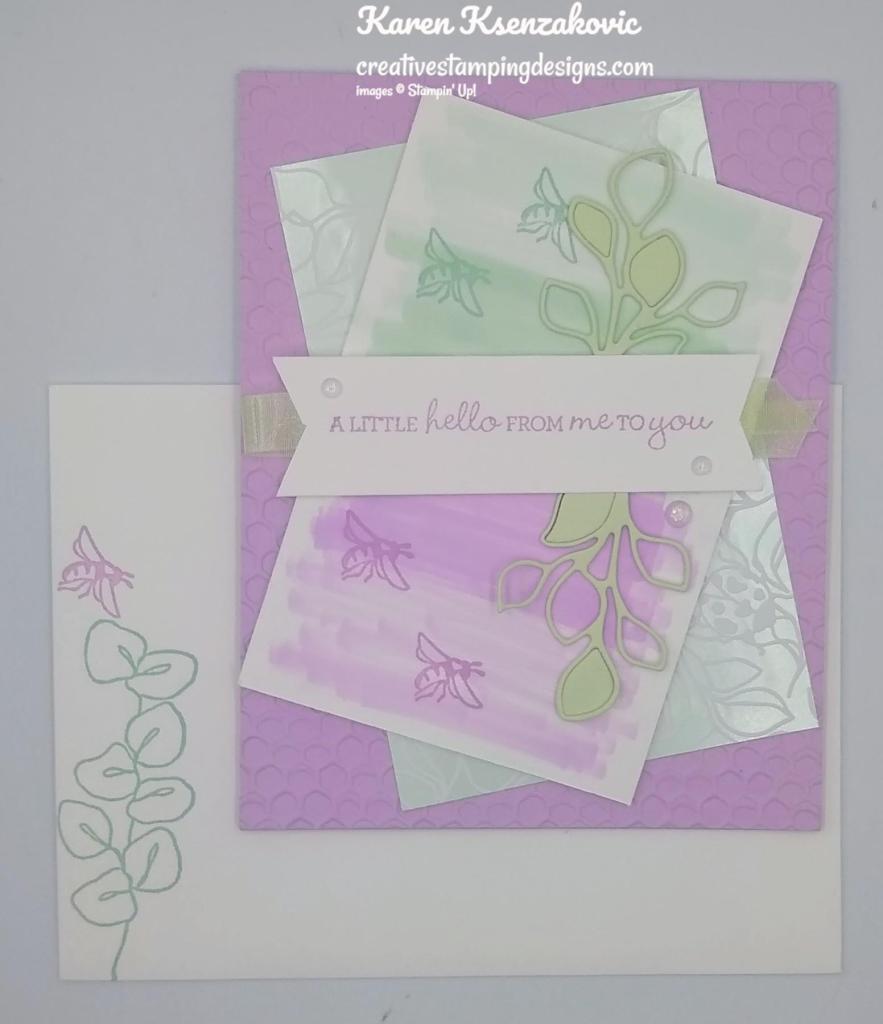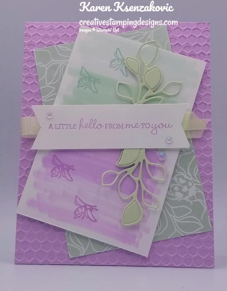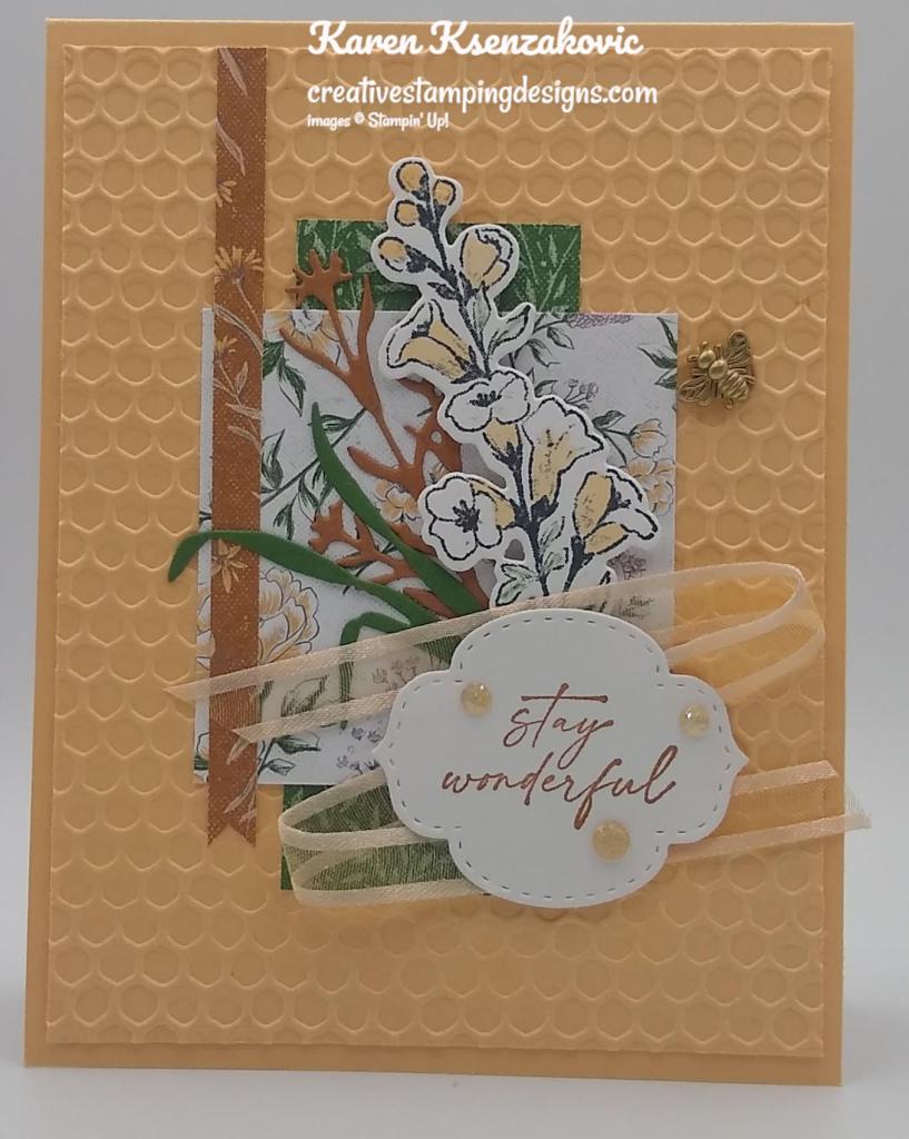I used the Stampin’ Up! Honeybee Home Bundle, the Stampin’ Up! Queen Bee Bundle, the Hive 3D Embossing Folder and the Beautiful Shapes Die for my Clean and Layered card. I was inspired by the inspiration photo 193b with the colors and bees. All these Items will be retiring at the end of the month except for the color. If you would have told me that less than a week after I got the new In-Colors that I would be using the Wild Wheat, I would have said you were crazy. It’s my least favorite color, but it works so well with these stamp sets.