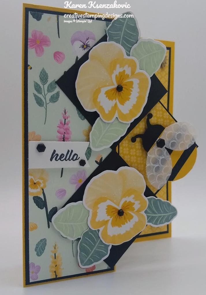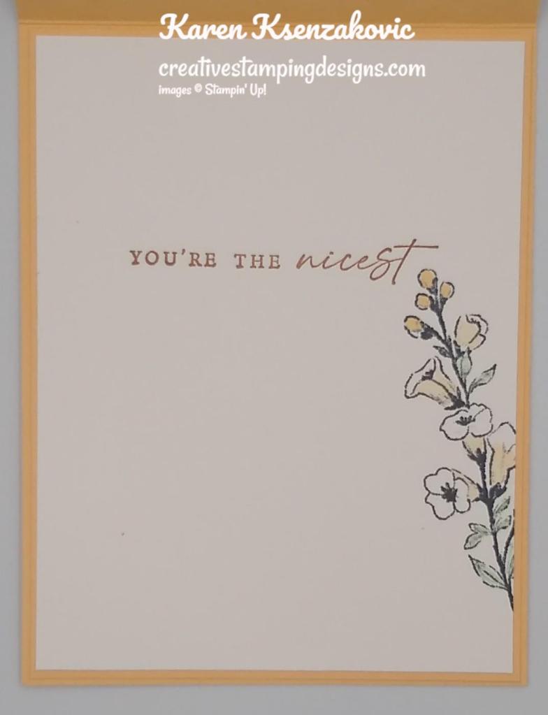 On the inside, I stamped the sentiment from the Honeybee Home stamp set in Wild Wheat Ink on a panel of Basic White. I stamped the 3 bees from the Honeybee Home stamp set in Tuxedo Black Ink by the sentiment and on the bottom of the panel. I colored the bees using my Wild Wheat Stampin’ Blends Markers. I adhered the Basic White panel to a Basic Black mat then to the inside of the Wild Wheat card base.