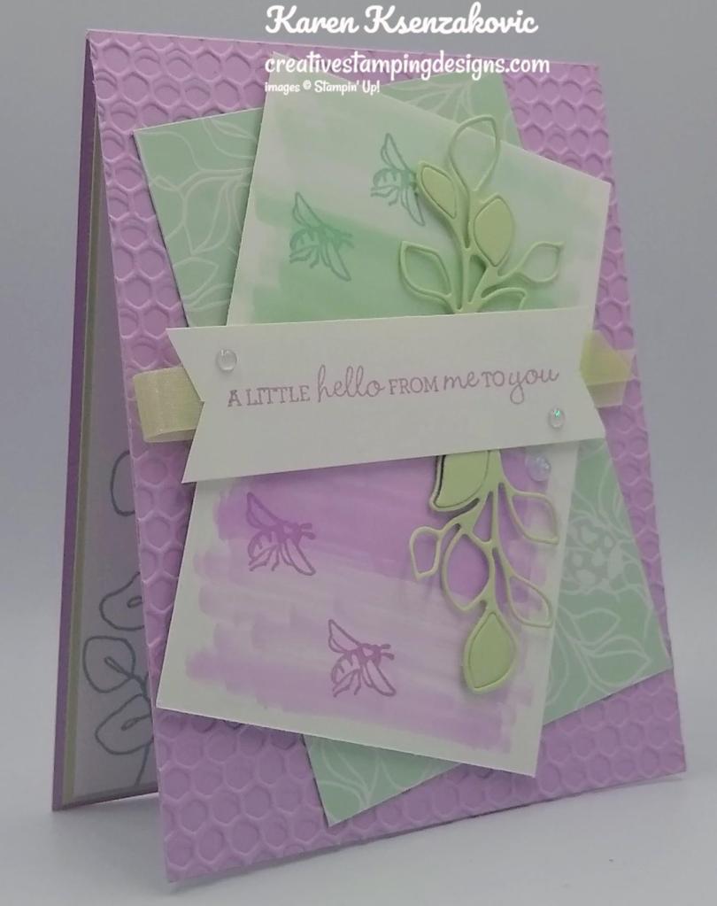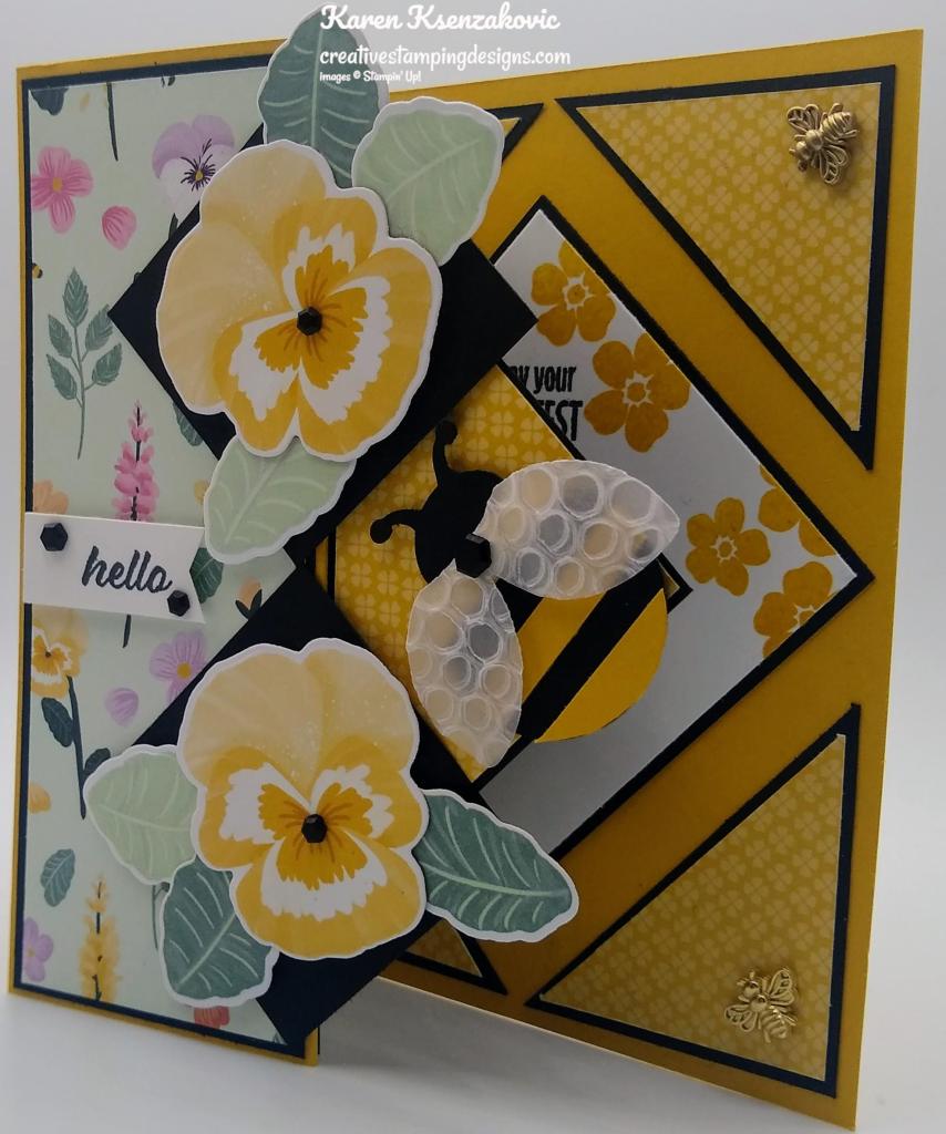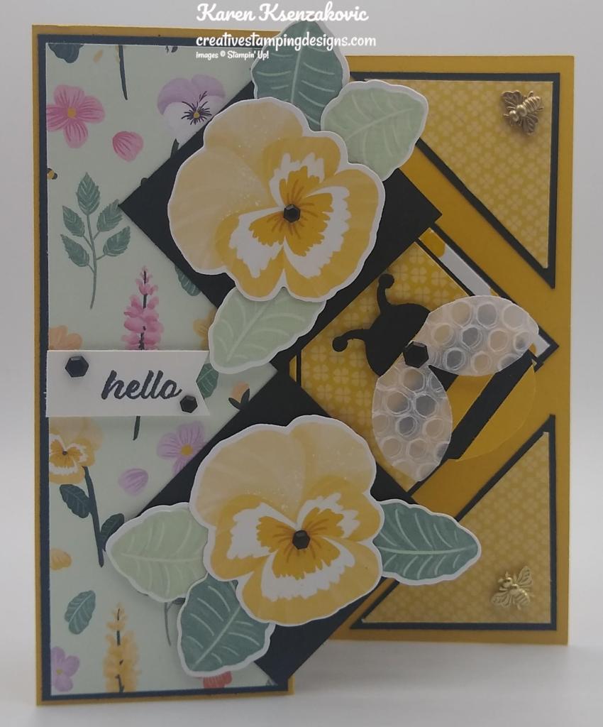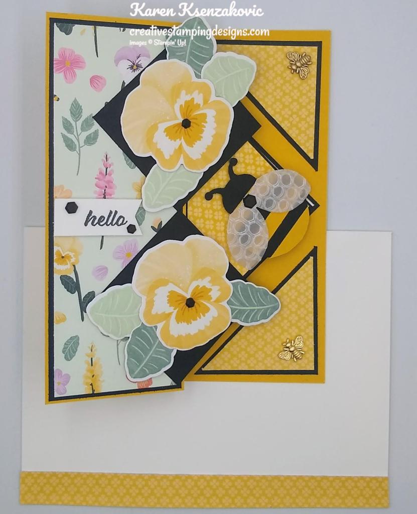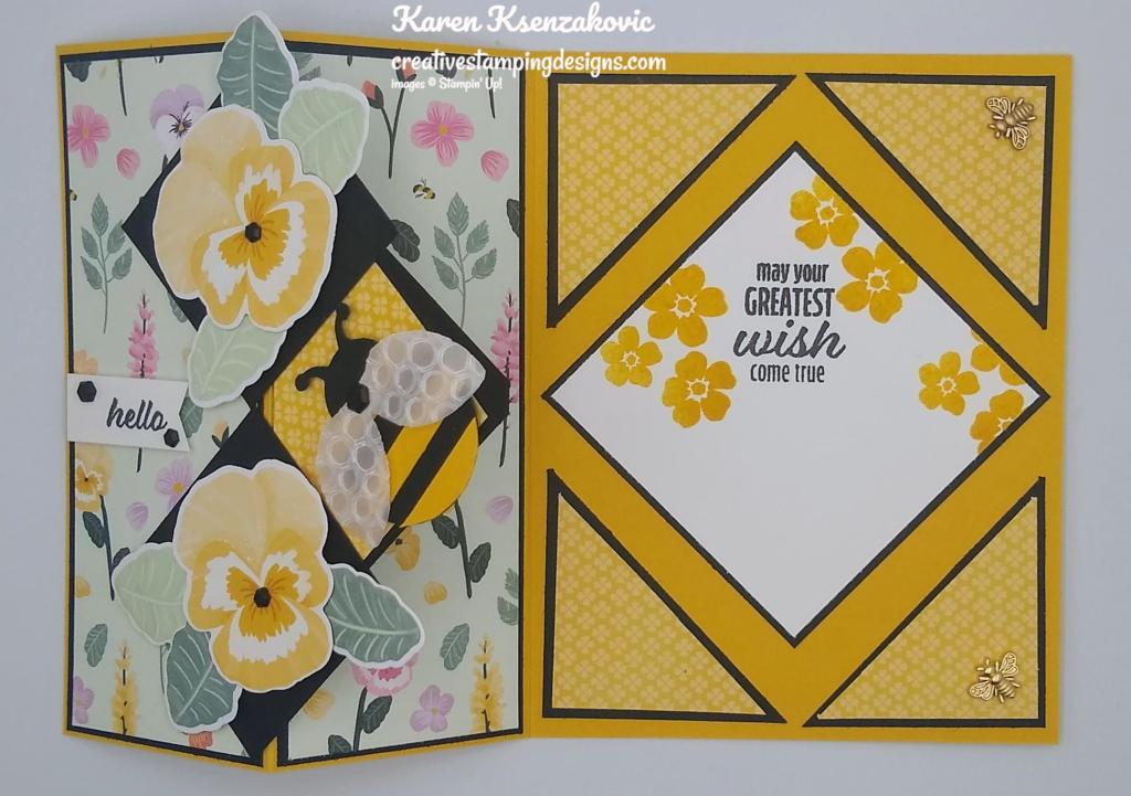 I adhered the hive embossed panel to a Wild Wheat card base using Multipurpose Liquid Glue. I adhered the die cut Basic Black card front over the embossed panel using Stampin’ Dimensionals. I adhered the bees to the card front using Stampin’ Dimensionals. I added some Iridescent Rhinestone Basic Jewels to the card front.