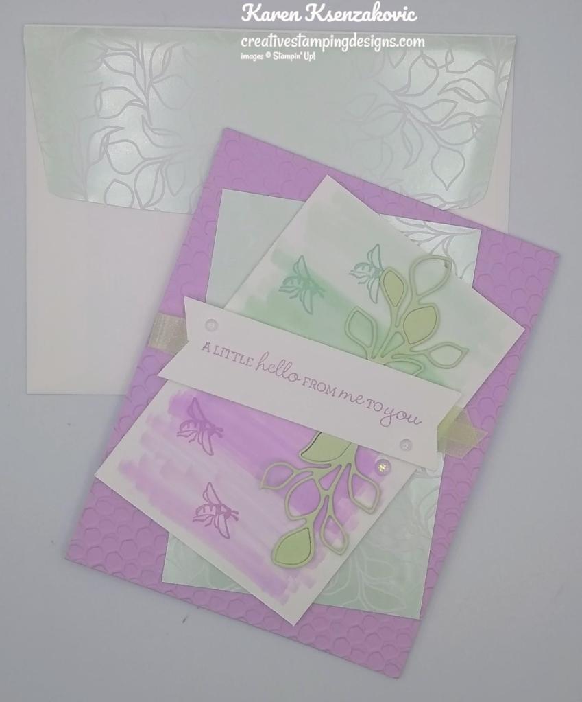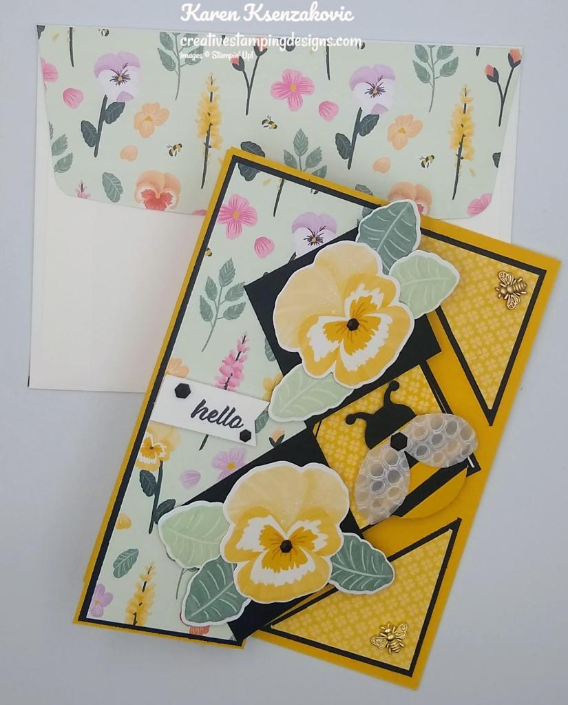 To finish my card, I decorated a Basic White Medium Envelope. I stamped the large bee from the Queen Bee stamp set on the envelope front in Tuxedo Black Ink. I stamped the 3 smaller bees from the Honeybee Home stamp set in Tuxedo Black Ink on the envelope flap. I colored all the bees in using my Wild Wheat Stampin’ Blends Marker.