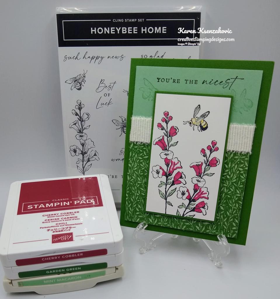 I used the Stampin’ Up! Honeybee Home Bundle, the Stampin’ Up! Queen Bee Bundle, the Hive 3D Embossing Folder and the Beautiful Shapes Die for my Clean and Layered card. I was inspired by the inspiration photo 193b with the colors and bees. All these Items will be retiring at the end of the month except for the color. If you would have told me that less than a week after I got the new In-Colors that I would be using the Wild Wheat, I would have said you were crazy. It’s my least favorite color, but it works so well with these stamp sets.