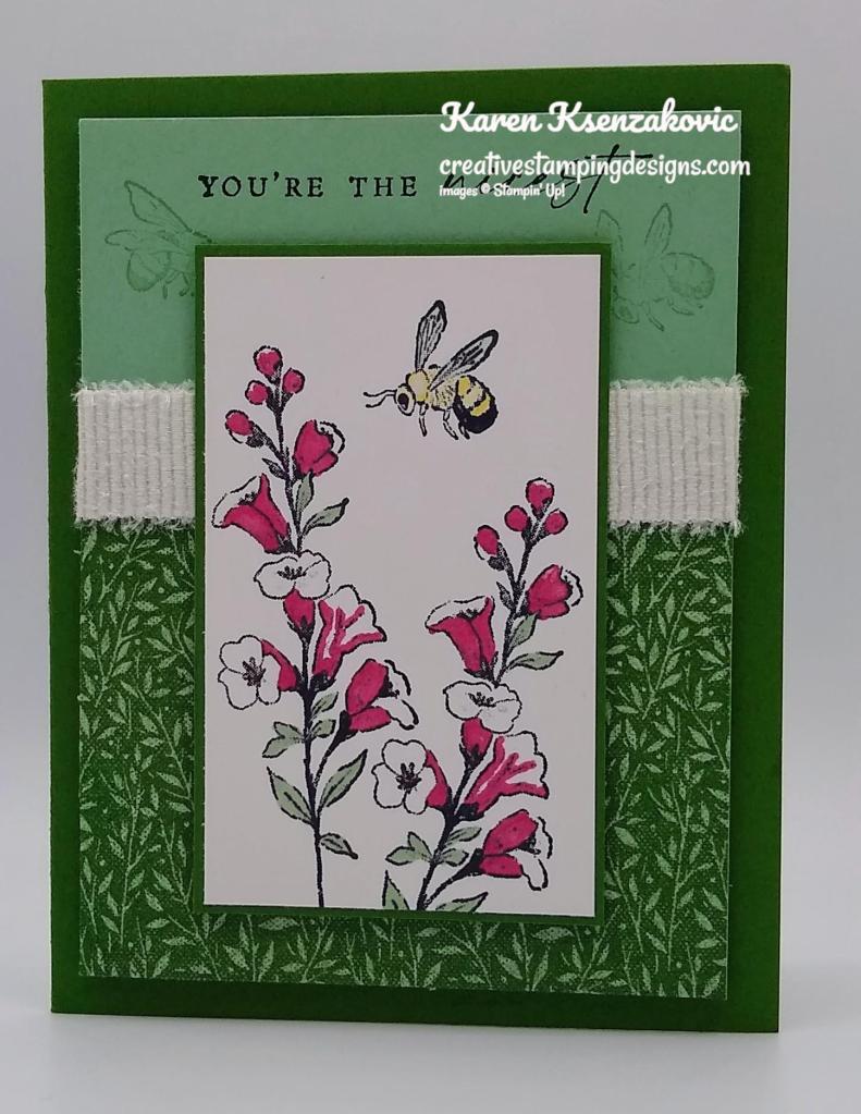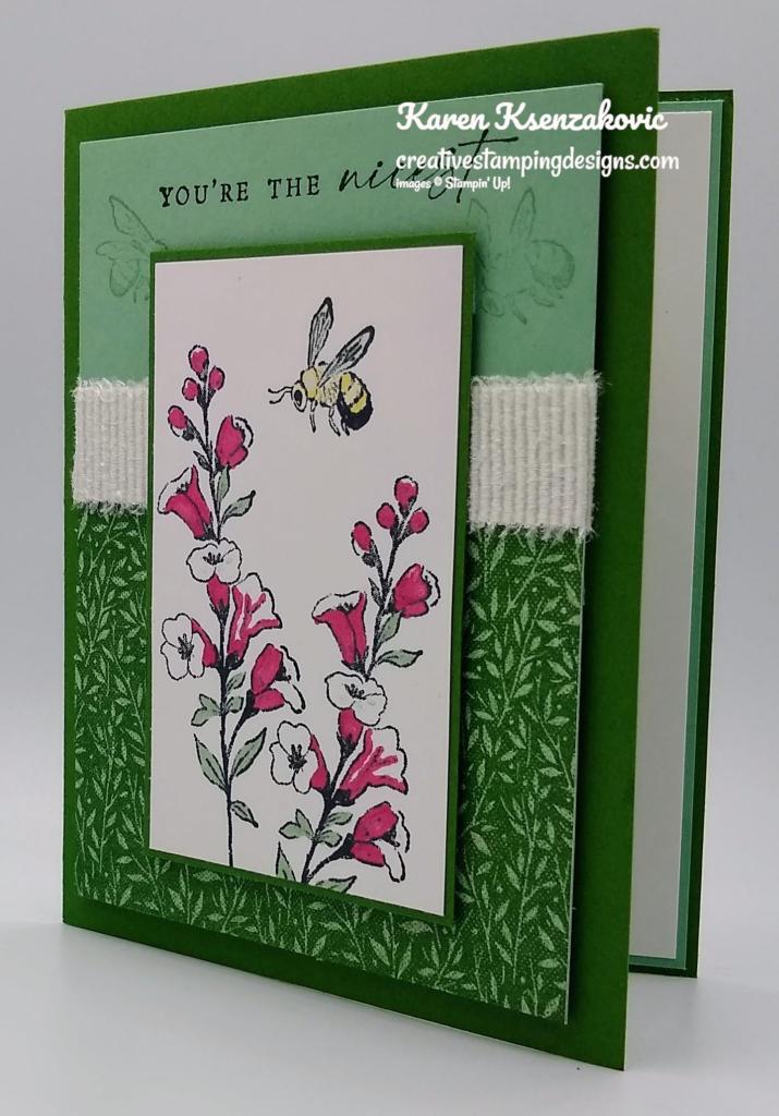I adhered the hive embossed panel to a Wild Wheat card base using Multipurpose Liquid Glue. I adhered the die cut Basic Black card front over the embossed panel using Stampin’ Dimensionals. I adhered the bees to the card front using Stampin’ Dimensionals. I added some Iridescent Rhinestone Basic Jewels to the card front.