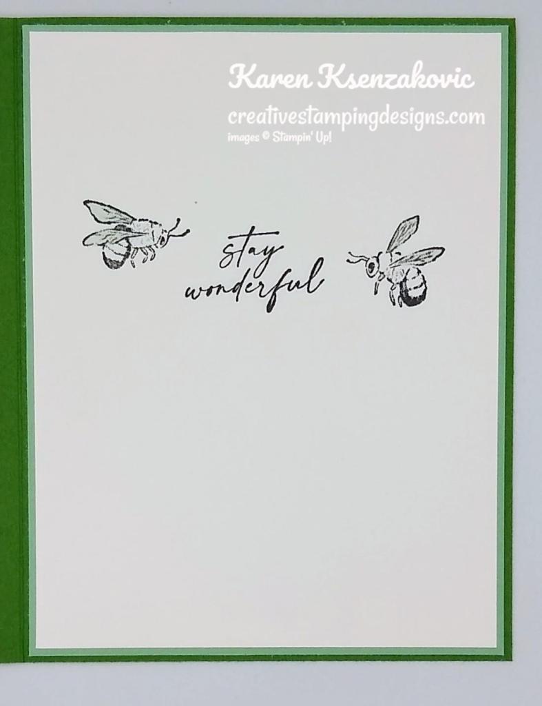 On the inside, I stamped the sentiment from the Honeybee Home stamp set in Wild Wheat Ink on a panel of Basic White. I stamped the 3 bees from the Honeybee Home stamp set in Tuxedo Black Ink by the sentiment and on the bottom of the panel. I colored the bees using my Wild Wheat Stampin’ Blends Markers. I adhered the Basic White panel to a Basic Black mat then to the inside of the Wild Wheat card base.