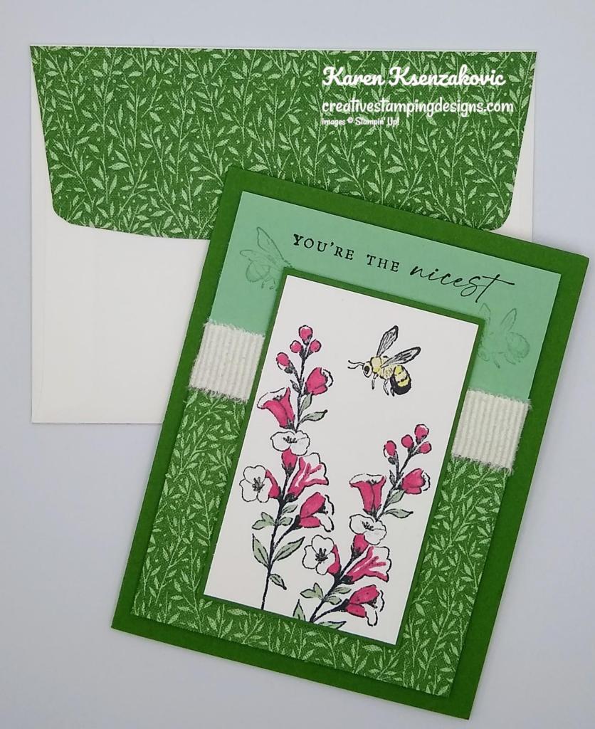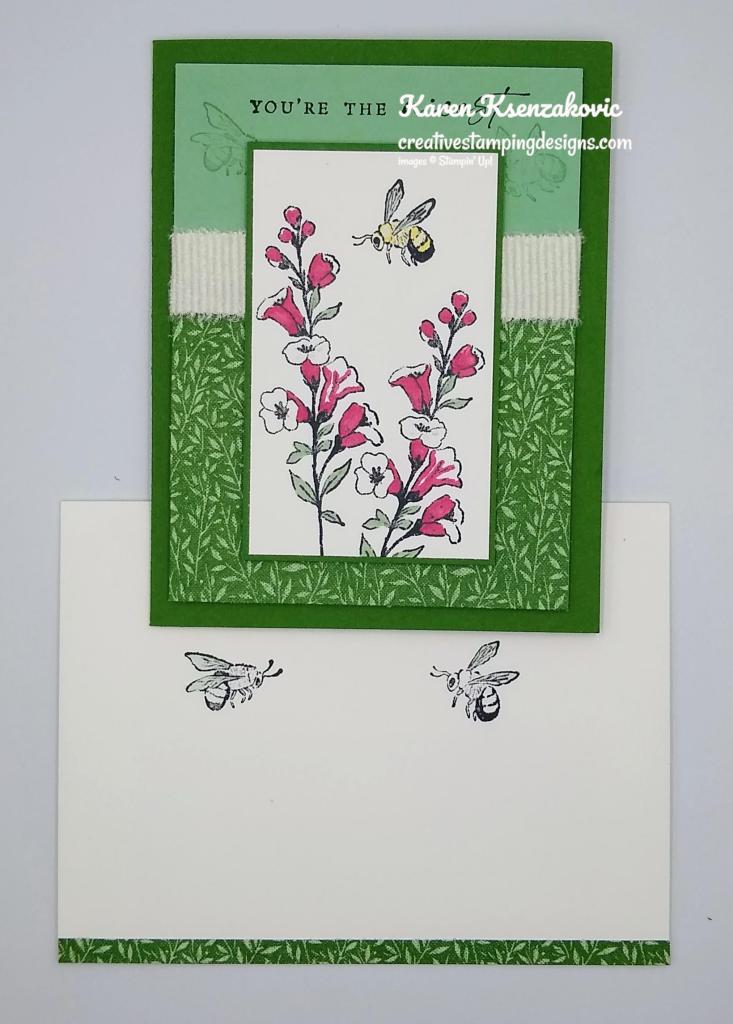 To finish my card, I decorated a Basic White Medium Envelope. I stamped the large bee from the Queen Bee stamp set on the envelope front in Tuxedo Black Ink. I stamped the 3 smaller bees from the Honeybee Home stamp set in Tuxedo Black Ink on the envelope flap. I colored all the bees in using my Wild Wheat Stampin’ Blends Marker.