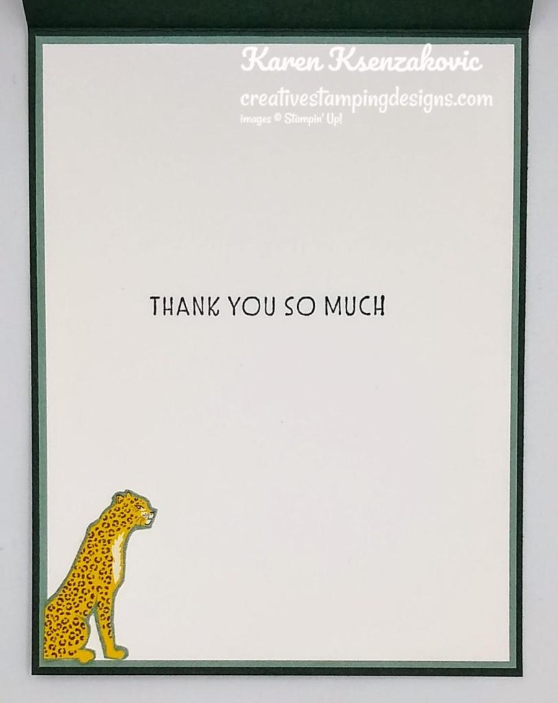 I adhered a panel of In the Wild DSP to the inside of the Soft Succulent card base. On a panel of Basic White cardstock I stamped the monkey image from the Catch You Later stamp set in Tuxedo Black Ink and colored it the same as the card front with my Stampin’ Blends Markers. I stamped the 2 sentiments from the Catch You Later stamp set by the monkey image. From the panel of Evening Evergreen cardstock I cut 2 of the string dies from the Hippo & Friends Dies. I cut 2 of the balloons from the Hippo & Friends Dies from scraps of Daffodil Delight and Real Red cardstock. I adhered the strings to the monkeys hands using Multipurpose Liquid Glue and the balloons to the strings using Stampin’ Dimensionals.