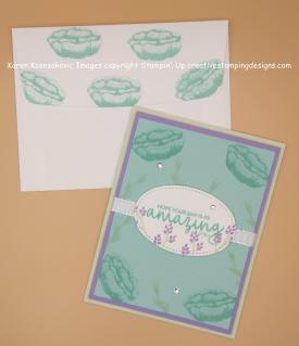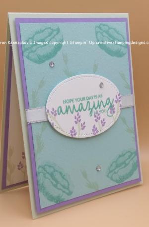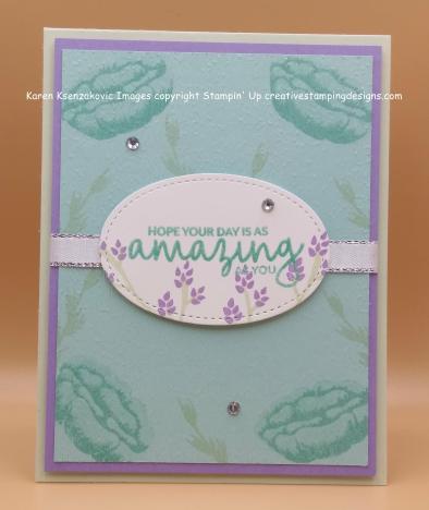 I started by stamping the sentiment from Incredible Like You stamp set in Pool Party Ink on a small piece of Whisper White cardstock. I immediately sprinkled it with Clear Stampin’ Emboss Powder and heat set it with my Heat Tool. You can emboss in any color when you use clear embossing powder. I then stamped the stems from the same stamp set in Soft Sea Foam Ink around the bottom of the sentiment, then stamped the flowers, from the same stamp set, on the stems in Highland Heather Ink. Using my Big Shot and the oval from the Stitched Shapes Framelits Dies, I cut the sentiment out and set it aside.