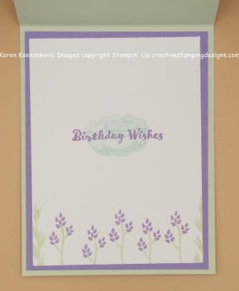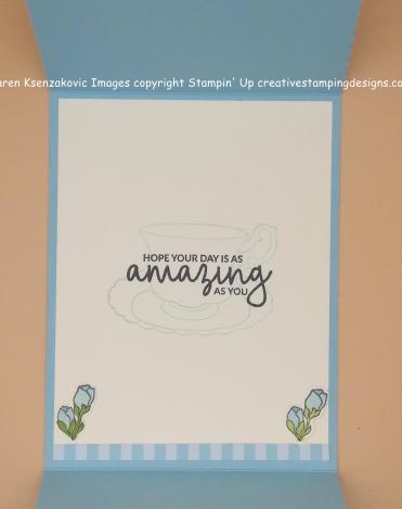 On the inside I stamped the stems and flowers from the Incredible Like You stamp set in Soft Sea Foam and Highland Heather Inks on the bottom of a Whisper White cardstock panel. I stamped the larger flower in the center of the Whisper White panel in Pool Party Ink, stamping the inside colored part off twice and the second part of the flower stamping off once. I stamped the sentiment from Stampin’ Up Itty Bitty Birthday Stamp Set in Highland Heather Ink over the top of the flower. I adhered the Whisper White panel to a Highland Heather mat using Snail and then to the inside of the Soft Sea Foam card base using Multipurpose Liquid Glue.