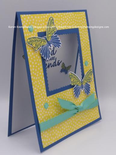 On a piece of scrap Whisper White cardstock I stamped one of the butterfly images from the Butterfly Gala stamp set in Blueberry Bushel Ink. I stamped the top wings of the butterfly in Pineapple Punch Ink. I then punched the 4 butterflies (2 large and 2 small) out using the Butterfly Duet Punch. I adhered the 2 larger butterflies to the window opening of the card front so that they hung over inside the window, using Stampin’ Dimensionals. I also added a few of the Glitter Enamel Dots to the card front.
