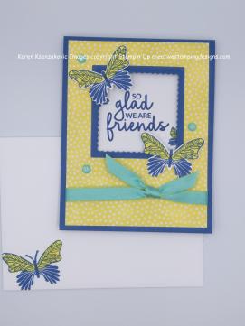 I adhered the stamped Whisper White panel to the inside of the Blueberry Bushel card base using Multipurpose Liquid Glue. I adhered the 2 smaller butterflies by the sentiment using Multipurpose Liquid Glue.