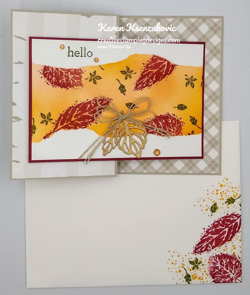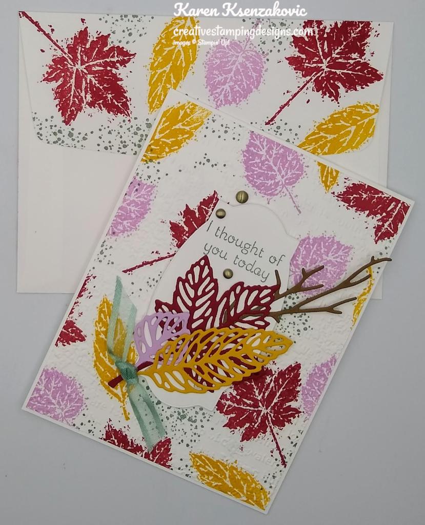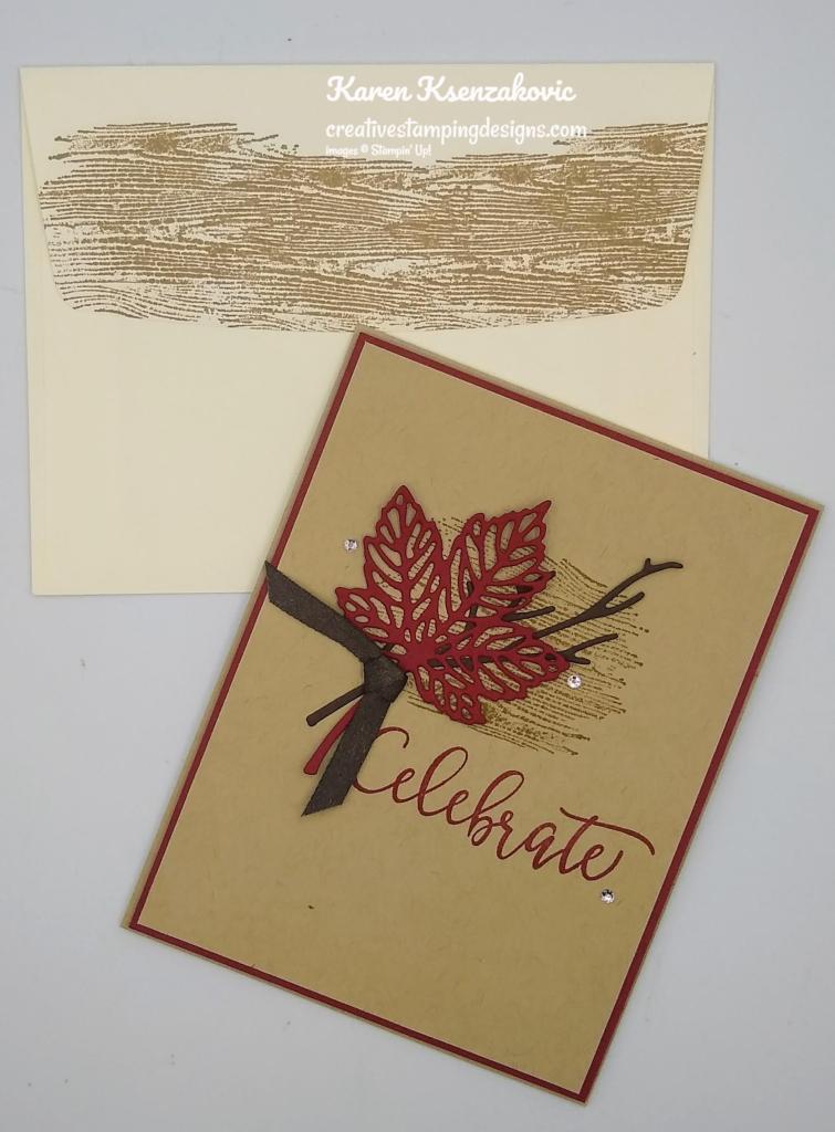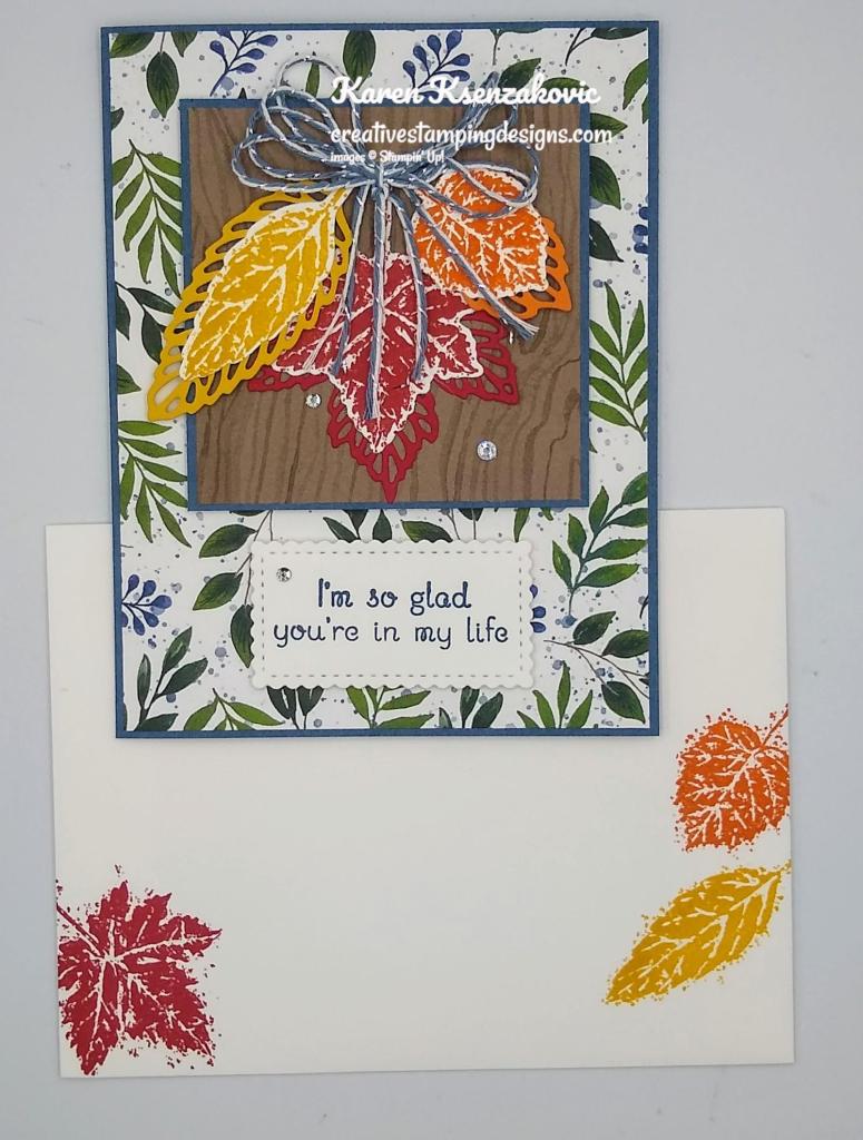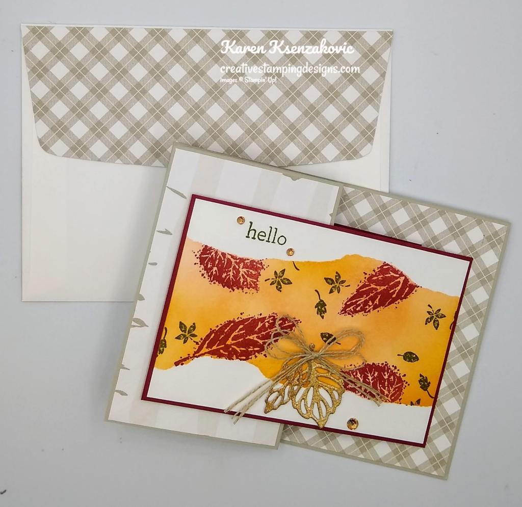 To finish my card I decorated a Basic White Medium Envelope. I stamped the trio leaves image from the Gorgeous Leaves stamp set, colored the same as I did for the card, on the envelope front. I adhered a panel of Cajun Craze from the Regals 6 X 6 Designer Series Paper to the envelope flap.