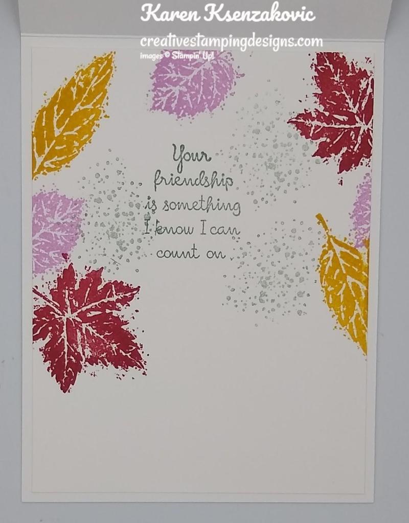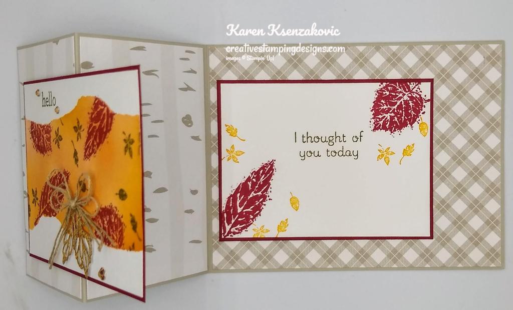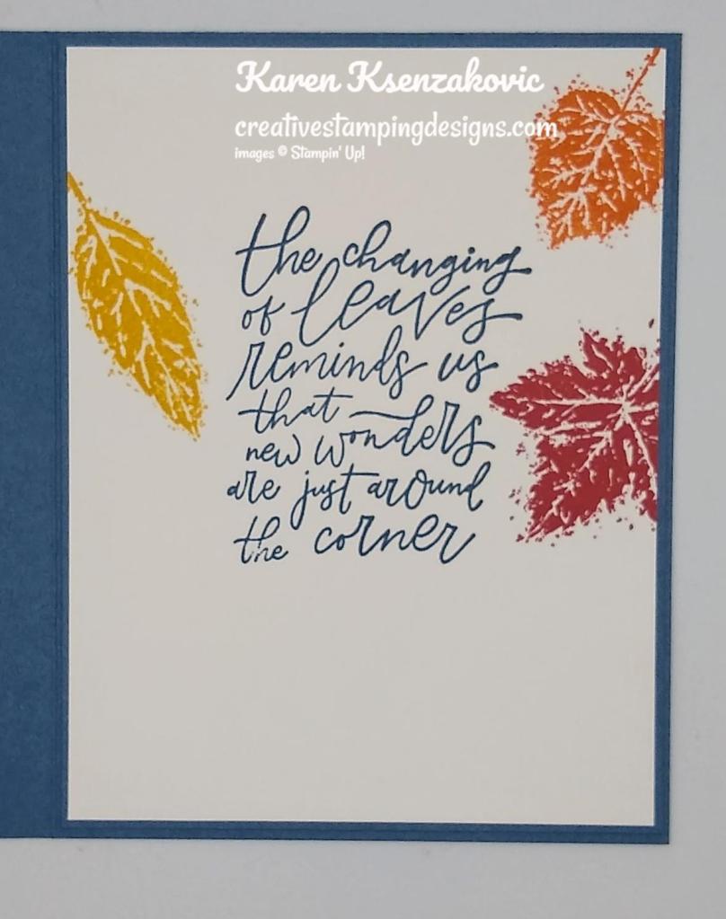 On the inside I stamped the sentiment from the Stampin’ Up! Beauty of Tomorrow Cling Stamp Set in Cajun Craze Ink on a Basic White panel. I stamped the trio leaf image from the Stampin’ Up! Gorgeous Leaves Cling Stamp Set on either side of the sentiment, coloring the stamp using my Cajun Craze, Pumpkin Pie and Pale Papaya Stampin’ Write Markers. I adhered the Basic White panel to a Pale Papaya mat and then to the inside of the Cajun Craze card base.