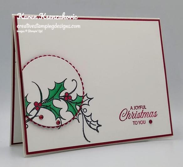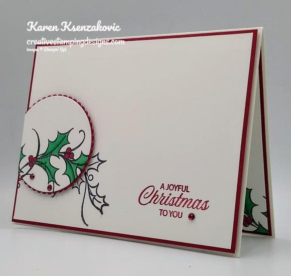 For today I have a clean and simple card using just the basics, Stamp, Ink & Paper. I did sneak in a couple rhinestones too. I used the Stampin’ Up! Joyful Holly Photopolymer Stamp Set for my card. This is a perfect card if you are a beginner stamper. Here’s my card for today.