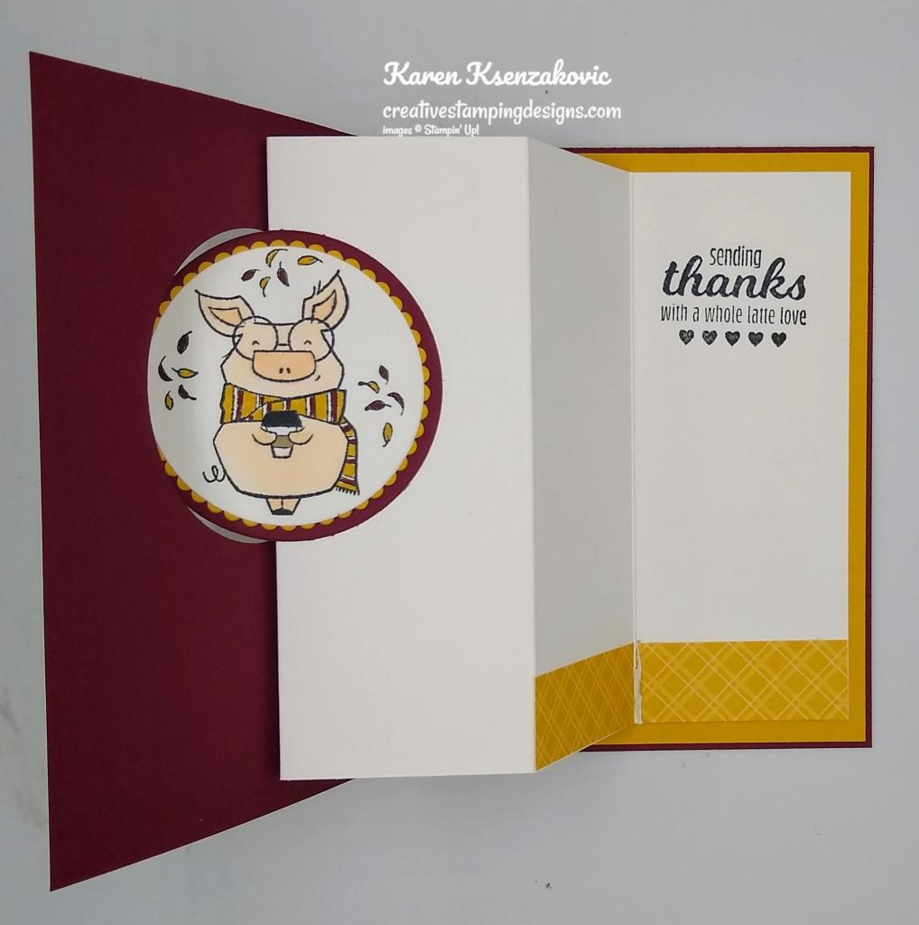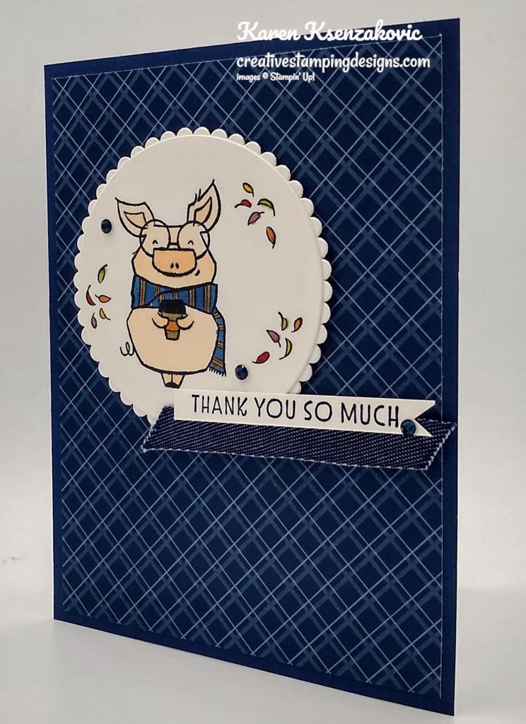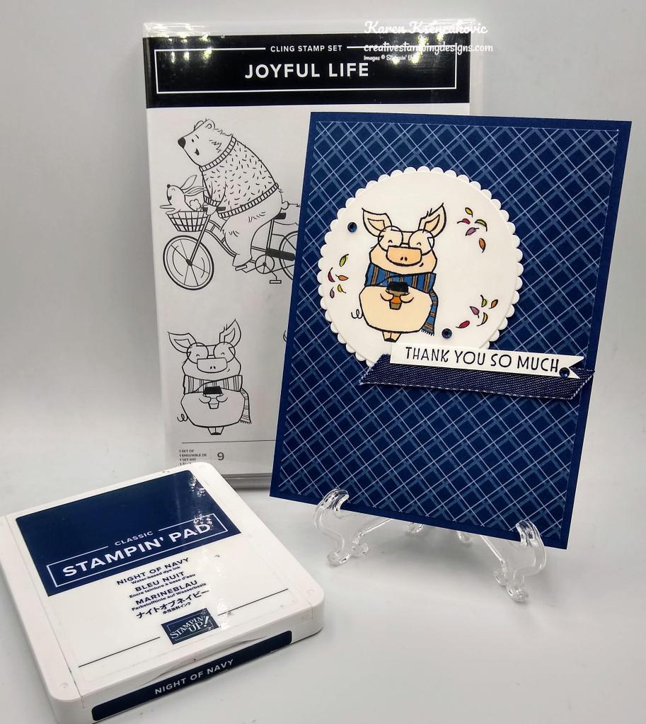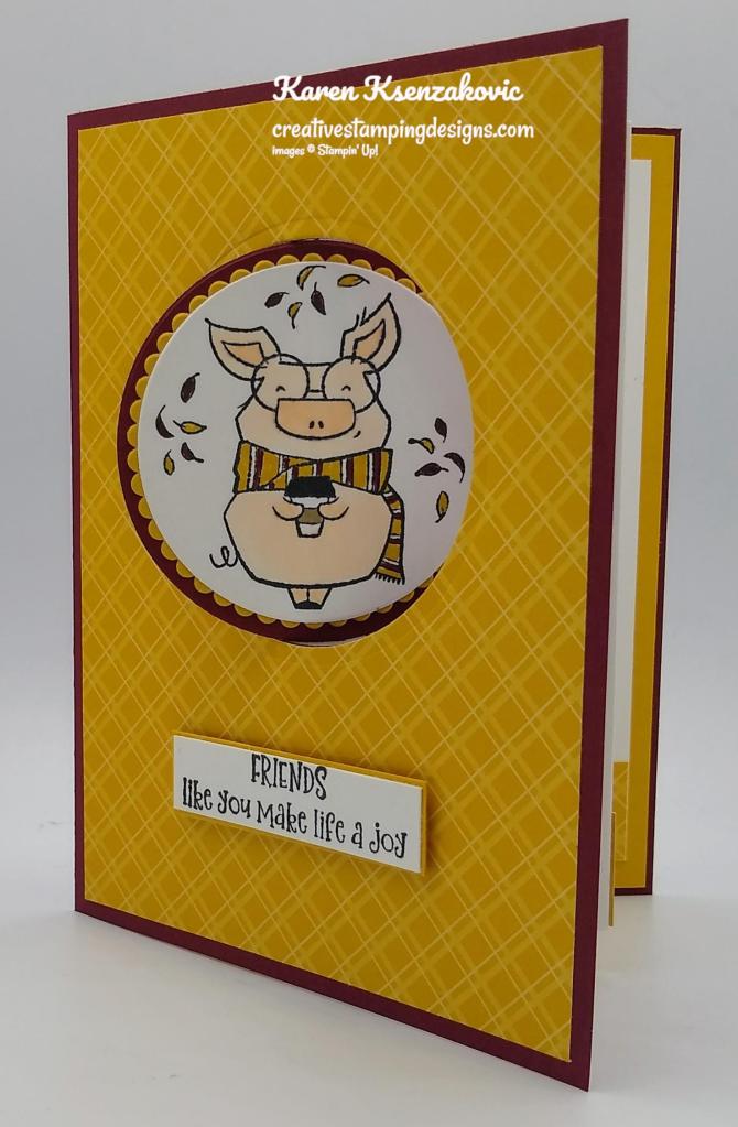 Using my Layering Circles Dies, I cut one of the solid circles and the coordinating scalloped circle from a panel of Basic White cardstock. On the solid circle I stamped the pig and leaf images from the Joyful Life stamp set in Tuxedo Black Ink to the left of the circle. I colored the images in using my Blackberry Bliss, Bronze, Crumb Cake, Daffodil Delight, Night of Navy, Old Olive, Petal Pink, Pumpkin Pie and Real Red Stampin’ Blends Markers. I adhered the solid circle to the scalloped circle using Stampin’ Seal and then to the card front using Stampin’ Dimensionals.