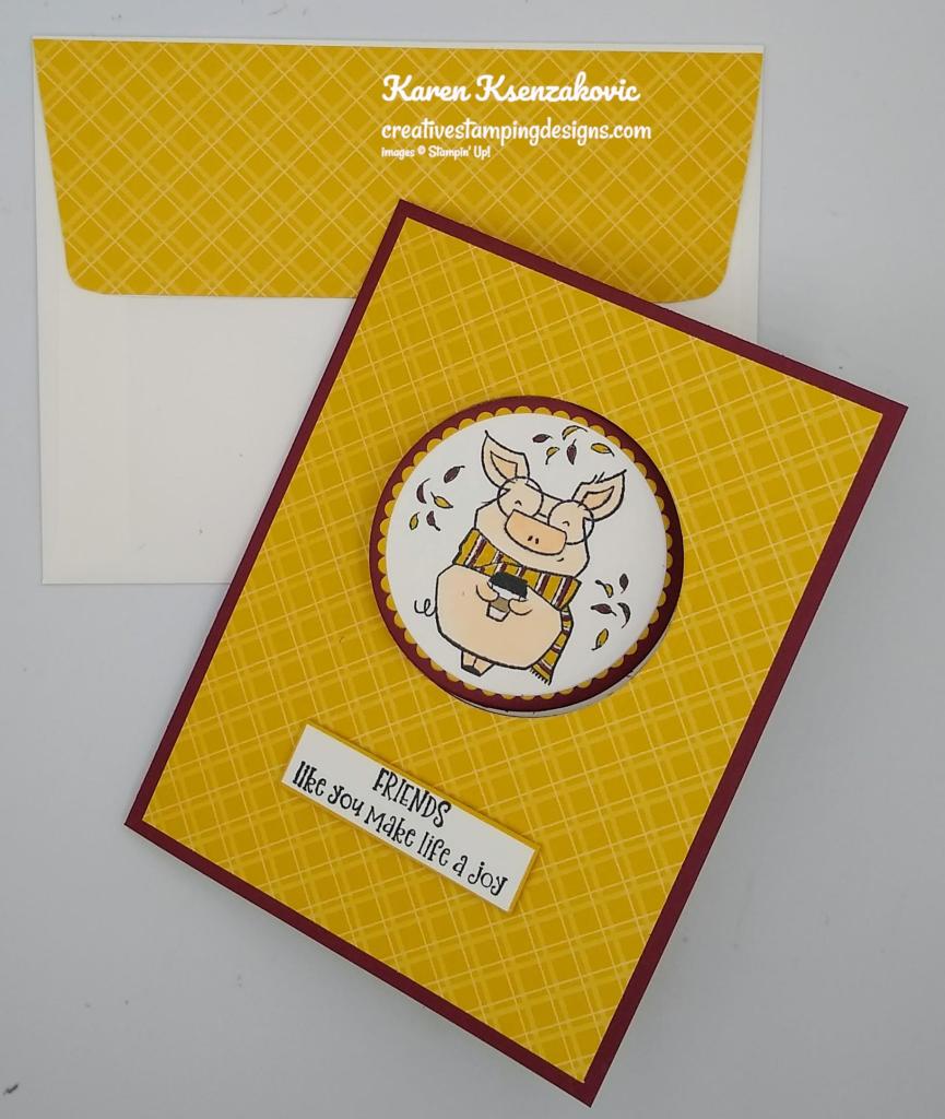 To finish my card I decorated a Basic White Medium Envelope. I stamped the pig and leaf images from the Joyful Life stamp set on the envelope front in Tuxedo Black Ink and colored it the same as I did for the card. I adhered a panel of the Neutrals DSP to the envelope flap.