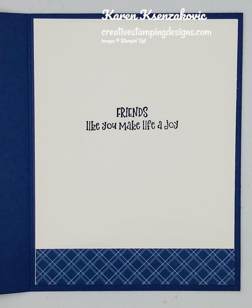 On the inside I stamped the sentiment from the Joyful Life stamp set on a panel of Basic White cardstock. I adhered a strip of the Neutrals DSP to the bottom of the panel using Stampin’ Seal. I adhered the Basic White panel to a Night of Navy mat using Stampin’ Seal and then to the inside of the Night of Navy card base using Multipurpose Liquid Glue.