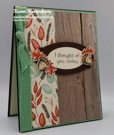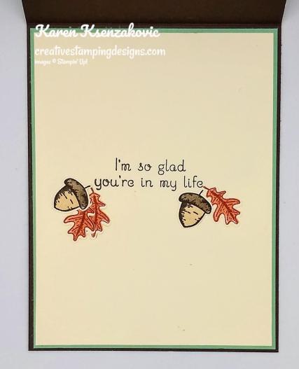 On a panel of Very Vanilla cardstock I stamped 6 leaves and 4 acorns from the Stampin’ Up! Beautiful Autumn Photopolymer Stamp Set . I stamped the acorn outline images in Early Espresso Ink, the acorn top in Early Espresso Ink, stamped off once, and the acorn bottom in Crumb Cake Ink. I stamped the leaf outline images in Cajun Craze Ink and the inside of the leaves in Cajun Craze Ink, stamped off once. I punched all the leaves and acorns out using the Autumn Punch Pack. I adhered the leaves and acorns to the sentiment using Glue Dots and Stampin’ Dimensionals. I adhered the card front to an Early Espresso card base using Stampin’ Dimensionals.