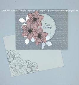 To finish my card I decorated a Medium Whisper White Envelope. I stamped the large flower image from the Floral Essence stamp set in Blueberry Bushel Ink on the bottom front of the envelope and colored it in using my Balmy Blue Stampin’ Blends Markers. I stamped the leaf images from the Floral Essence stamp set in Old Olive Ink around the flower. I stamped the flower center from the Floral Essence stamp set in Crushed Curry Ink in the center of the flower. I adhered a panel of Perennial Essence DSP to the envelope flap.