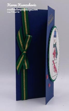 I adhered the Mossy Meadow panel to a Copper Foil Sheet mat using Multipurpose Liquid Glue. I adhered 2 thin strips of Copper Foil Sheet to the card front using Snail. I adhered the ornament by the boughs and on the foil strips using Stampin’ Dimensionals and adhered the card front to the card base using Stampin’ Dimensionals.