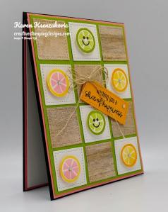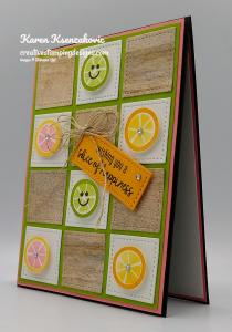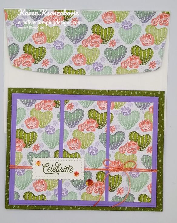 I wrapped a piece of the Calypso Coral Twine around the panel and tied a small bow. I adhered a panel of Flowering Cactus DSP to a Highland Heather card base using Stampin’ Seal. I adhered the artwork to the card front using Stampin’ Dimensionals.