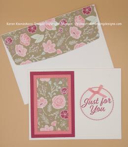 To finish my card I decorated a Basic White Medium Envelope. I stamped the small flower from the Art Gallery stamp set in Petal Pink Ink on the envelope front. I adhered a panel of Fine Art Floral DSP to the envelope flap.