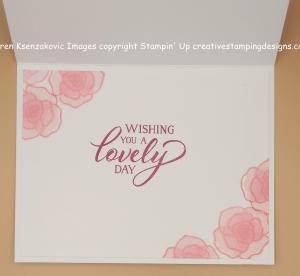 On the inside I stamped the sentiment from the Stampin’ Up! Peaceful Moments Cling Stamp Set in Soft Suede Ink in the center of a Basic White panel. I stamped the small flower from the Art Gallery stamp set in Petal Pink Ink on the bottom of the panel. I adhered the Basic White panel to a Soft Suede mat using Stampin’ Seal and then to the inside of the Petal Pink card base using Multipurpose Liquid Glue.