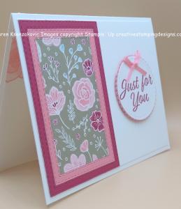 I used the Stampin’ Up! Meant To Be Cling Stamp Set for my card along with the Fine Art Floral Designer Series Paper and the Golden Garden Designer Specialty Acetate Paper. I played along with Just Us Girls challenge #570. They have a Word Week and it’s Valentine.