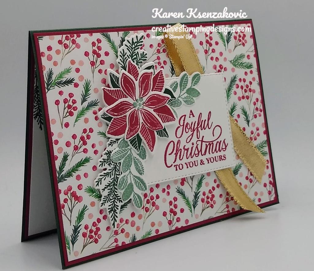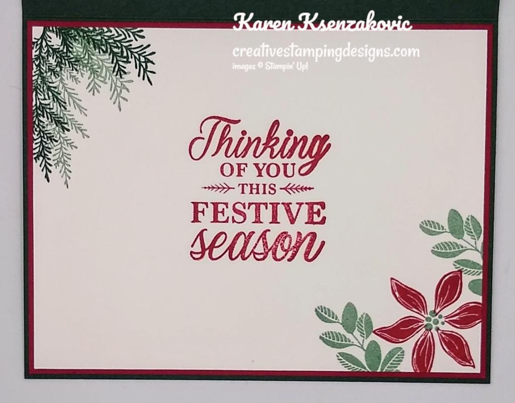 On the inside I stamped the sentiment from the Brightly Glow stamp set in Tuxedo Black Ink on a panel of Basic White cardstock. I stamped the poinsettia images from the Merriest Moments stamp set on the top and bottom corners of the panel in Cherry Cobbler Ink. I adhered the Basic White panel to a Cherry Cobbler mat and then to the inside of the Basic White Thick card base.