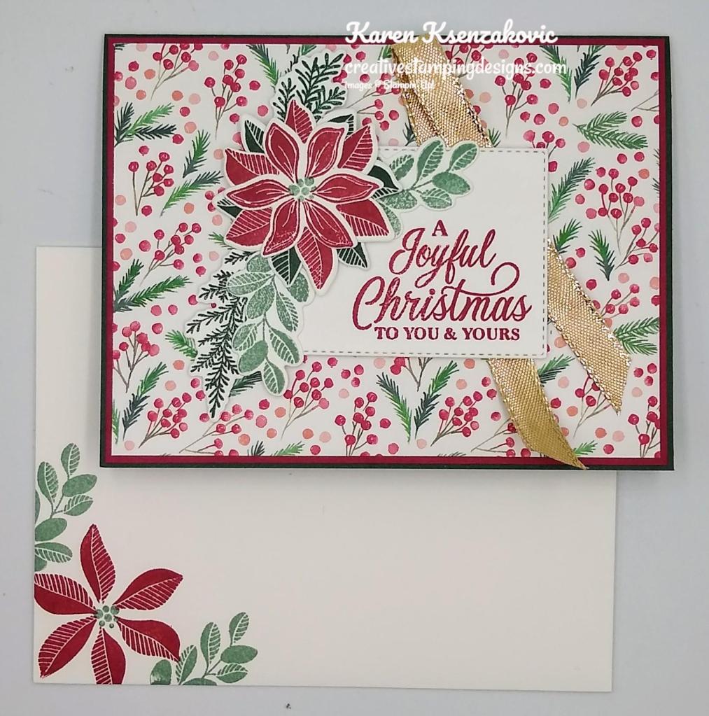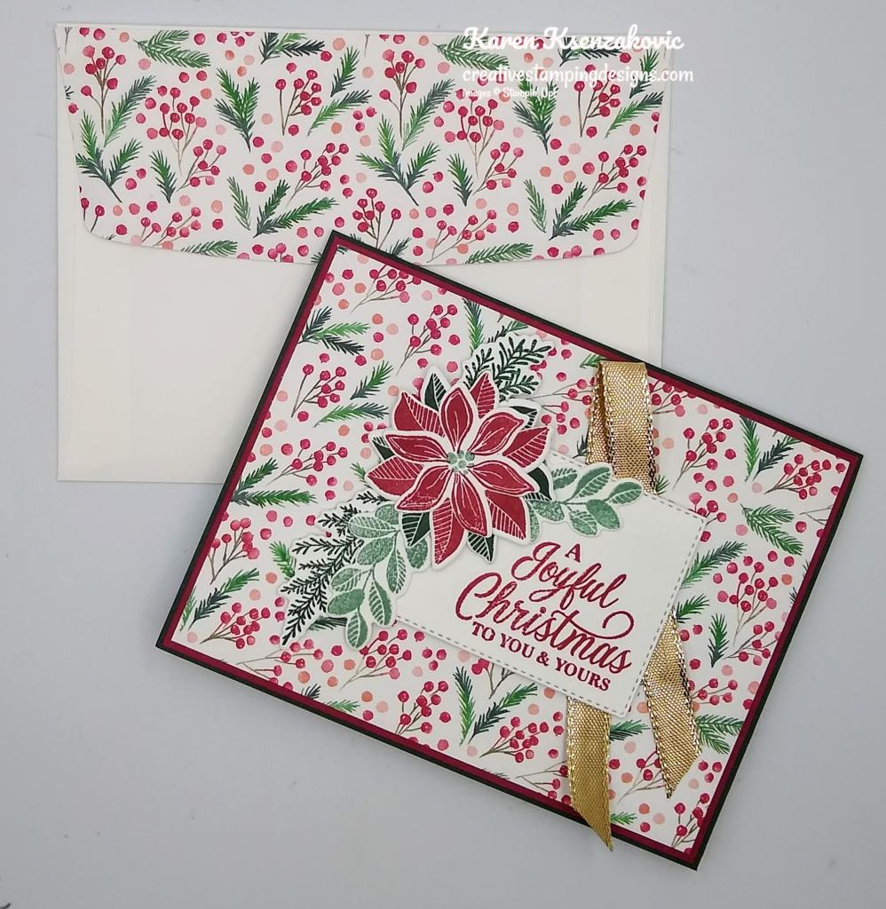 To complete my card, I decorated a Basic White Medium Envelope. I stamped the poinsettia images from the Merriest Moments stamp set in Cherry Cobbler Ink on the envelope front and flap.