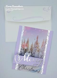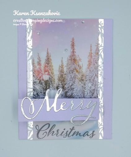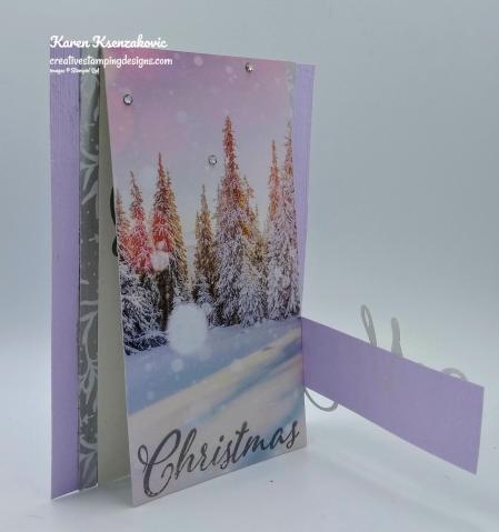 I adhered a panel of the Feels Like Frost Specialty DSP to my thin Whisper White card base using Multipurpose Liquid Glue. I adhered the band to the back of the card base, so that it wrapped around the front, using Snail. I adhered the Whisper White card base to the Purple Posy card base using Multipurpose Liquid Glue. I adhered 2 thin strips of the Feels Like Frost Specialty DSP to either side of the thin card base using Multipurpose Liquid Glue. I stamped the Christmas sentiment from the Stampin’ Up! Merry Christmas To All Photopolymer Stamp Set on the bottom front of the DSP in Smoky Slate Ink.