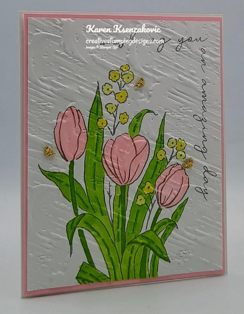 Good Tuesday morning my stamping friends welcome to Amy’s Inkin’ Krew Team Blog Hop. It’s the 2nd Tuesday of the month so that means Blog Hop Day!! If you are starting with me, be sure to hop around to see everyone’s beautiful projects. If you’ve hopped over from Ann Louise’s blog, welcome to my blog and thank you for stopping by. The theme this month is “Celebrate Spring”. We can interpret this however we want. Tulips said spring to me since they all bloom in my front yard in the spring. If you’d like to see a quick video on how I made this card, Click Here to go to my Instagram Reels. Here’s my card for today.