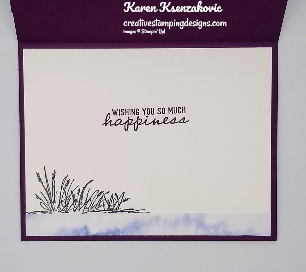 On the inside I stamped the sentiment from the Paradise Palms stamp set in Tuxedo Black Ink on a Basic White panel. I stamped the palm tree images from the Paradise Palms stamp set in Tuxedo Black Ink on the side of the panel. I adhered a strip of the New Horizons DSP to the top of the panel. I adhered the Basic White panel to a Basic Black mat and then to the inside of the Pale Papaya card base.
