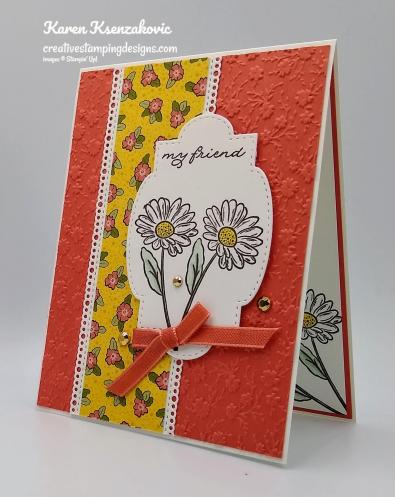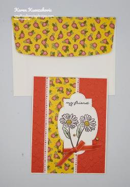 To finish my card I decorated a Medium Whisper White Envelope. I stamped the daisy image from the Ornate Style stamp set in Early Espresso Ink, stamping off twice, on the envelope front. I adhered a panel of the Ornate Garden Specialty DSP to the envelope flap.