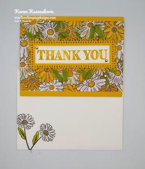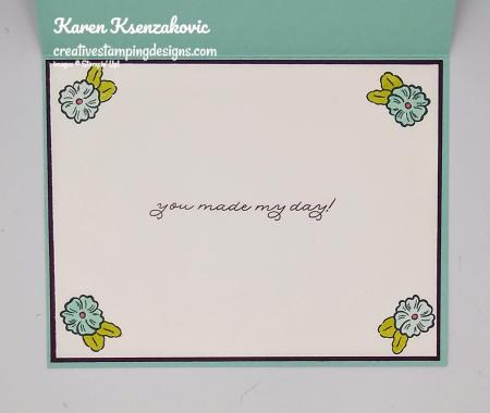 On the inside I stamped the sentiment from the Stampin’ Up! Itty Bitty Birthdays Cling Stamp Set in Bumblebee Ink in the center of a Whisper White panel. I stamped the daisy image from the Stampin’ Up! Ornate Style Cling Stamp Set in Early Espresso Ink, stamping off twice, on the bottom of the panel. I adhered the Whisper White panel to a Bumblebee mat using Stampin’ Seal and then to the inside of the Old Olive card base using Multipurpose Liquid Glue.