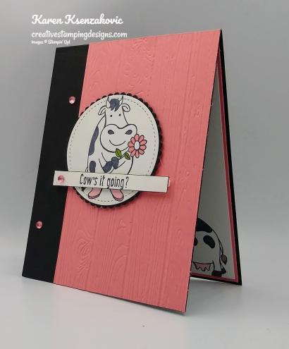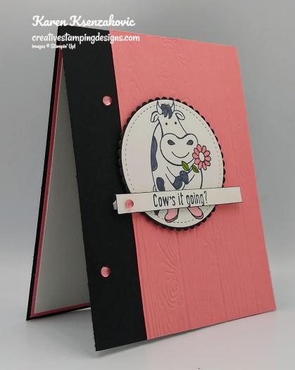 On a panel of Whisper White cardstock I stamped one of the cow images from the Stampin’ Up! Over The Moon Cling Stamp Set in Tuxedo Black Memento Ink. I colored the image in using my Light Basic Black, Flirty Flamingo and Dark Granny Apple Green Stampin’ Blends Markers. I cut the image out using the 2nd largest circle from the Stitched Shapes Dies. I cut a scalloped circle from a panel of Basic Black cardstock using my Layering Circles Dies. I adhered the artwork to the scalloped circle using Snail and adhered it to the card front using Stampin’ Dimensionals.