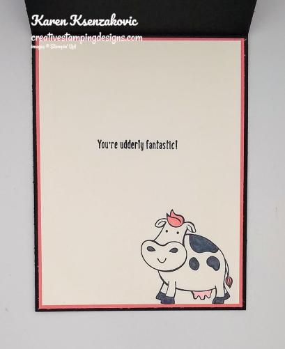 On the inside I stamped the sentiment from the Over The Moon stamp set in Tuxedo Black Memento Ink in the center of a Whisper White panel. I just love puns. I stamped another one of the cow images from Over The Moon stamp set on the bottom of the panel in Tuxedo Black Memento Ink and colored it in using my Light Basic Black and Flirty Flamingo Stampin’ Blends Markers. I adhered the Whisper White panel to a Flirty Flamingo mat using Snail and then to the inside of the Basic Black card base using Multipurpose Liquid Glue.