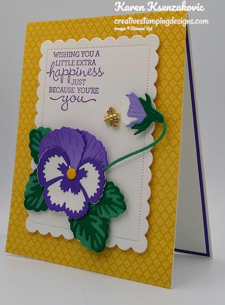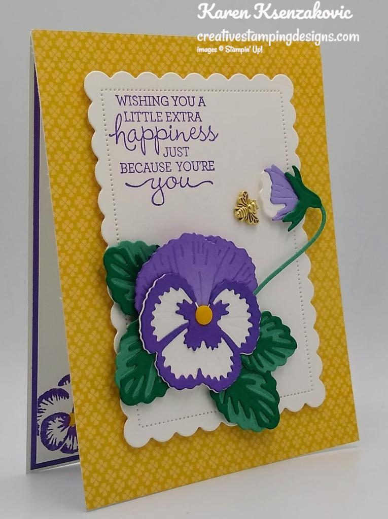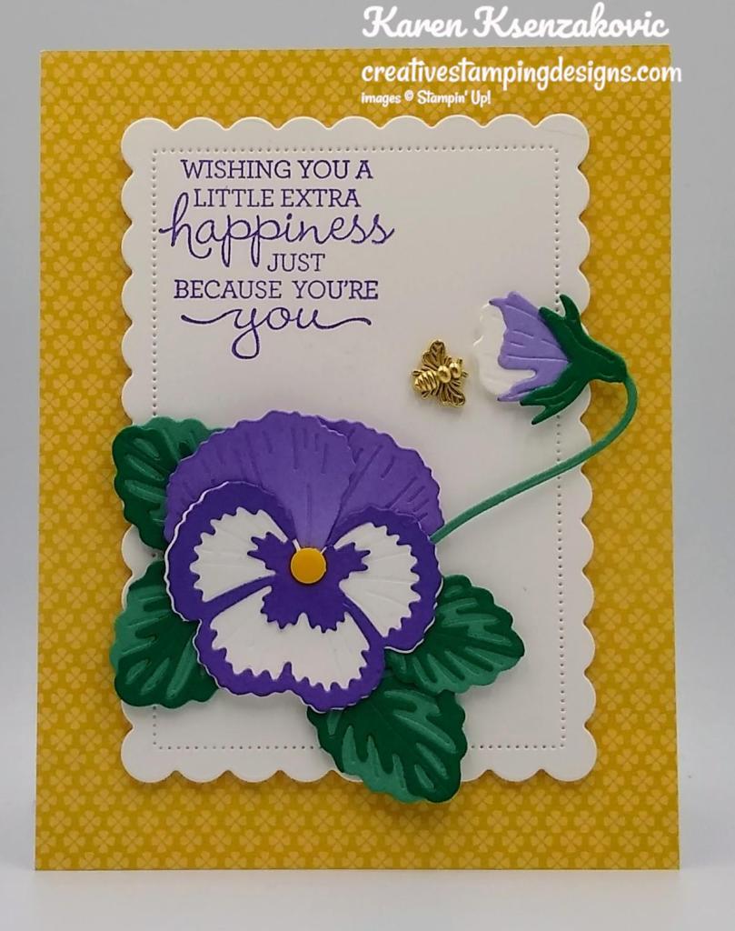 I cut 2 of the flower images from a panel of Pansy Petals DSP and 6 of the leaf images from another panel of Pansy Petals DSP using my Pansy Dies. I adhered the leaves to the back of the die cut flower using Glue Dots. I adhered 2 of the 1 7/8″ Basic Black squares to the card front as diamonds lining up the corners with the edge of the matted DSP. I adhered the die cut pansies to the diamonds using Stampin’ Dimensionals. I stamped the sentiment from the Stampin’ Up! Hello Ladybug Photopolymer Stamp Set in Tuxedo Black Ink on a strip of Basic White cardstock. I cut the strip using my Banner Pick A Punch and adhered it to the card front using Stampin’ Dimensionals. I adhered 2 of the Adhesive-Backed Hexagons to the sentiment and 2 to the flower centers.