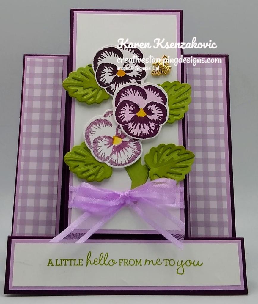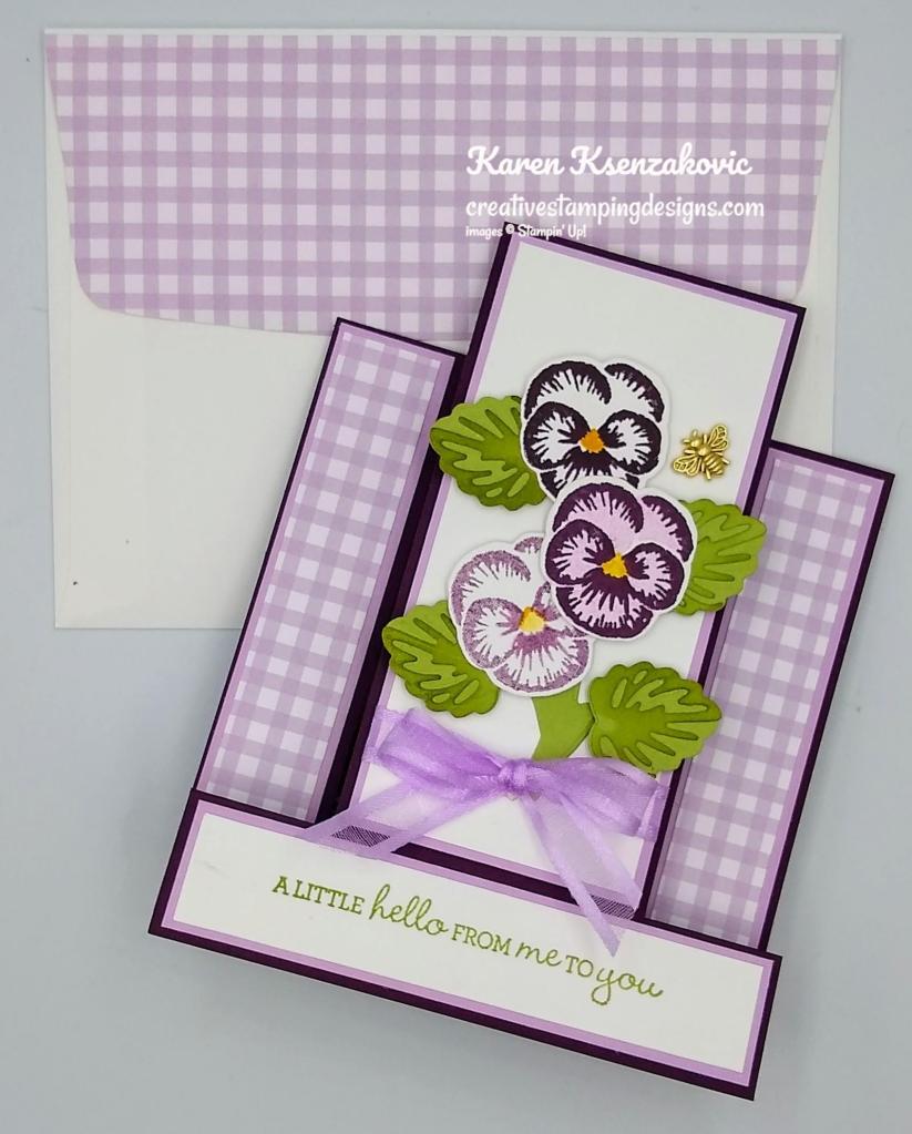 - Pansy Petals Designer Series Paper 2 – 1 7/8″ X 5 1/4″ (card front and inside panels), 2 – 1 3/4″ X 1 3/4″ (cut into triangles for inner liner), 2 3/4″ X 2 3/4″ (cut into triangle for mechanism), pansy and leaf panels cut with pansy dies, 1/2″ X 6″ & 2 1/4″ X 6″ (envelope)