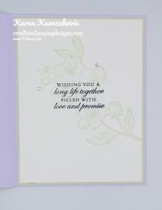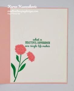 On the inside I stamped the sentiment from the Stampin’ Up! Prized Peony Cling Stamp Set in Night of Navy Ink in the center of a Basic White panel. I stamped the small flower from the Prized Peony stamp set on the bottom of the panel in Tuxedo Black Ink and colored it in using my Petal Pink and Soft Seafoam Stampin’ Blends Markers. I adhered the Basic White panel to a Petal Pink mat using Stampin’ Seal and then to the inside of the Night of Navy card base using Multipurpose Liquid Glue.