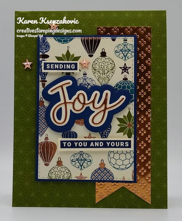 I cut a panel of the Brightly Gleaming Specialty DSP using my Stitched Rectangle Dies and adhered it to a Night of Navy mat using Stampin’ Seal. I cut the ‘Joy’ sentiment out using my Joy Dies cutting the thin word from a panel of Copper Foil, the mat from a panel of Very Vanilla cardstock and the bubble mat from a panel of Night of Navy cardstock. I adhered the Copper word to the Very Vanilla mat using tiny amounts of Multipurpose Liquid Glue and then to the Night of Navy bubble mat using Multipurpose Liquid Glue. I adhered it to the stitched panel using Stampin’ Dimensionals. I stamped the other 2 sentiments from the Stampin’ Up! Peace & Joy Photopolymer Stamp Set in Night of Navy Ink on a Very Vanilla panel and fussy cut them using my Paper Snips. I adhered them above and below the ‘Joy’ using Stampin’ Dimensionals.