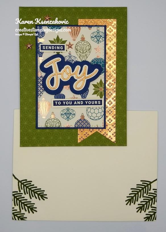 I cut a panel of Copper Foil into a banner using my Triple Banner Punch and embossed it using my Wrapped In Texture Embossing Folder. I adhered the banner to the card front using Multipurpose Liquid Glue. I adhered the artwork to the card front, over the banner, using Stampin’ Dimensionals. I added a few Star Designer Elements to the card front.