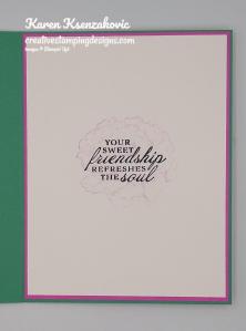 On the inside I stamped the sentiment from the Prized Peony stamp set in the center of a Very Vanilla panel using Tuxedo Black Ink. I stamped the small flower from the Prized Peony stamp set over the sentiment, stamping off 3 times, in Tuxedo Black Ink. I adhered the Very Vanilla panel to a Very Vanilla mat using Stampin’ Seal and then to the inside of the Thick Very Vanilla card base using Stampin’ Seal.