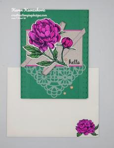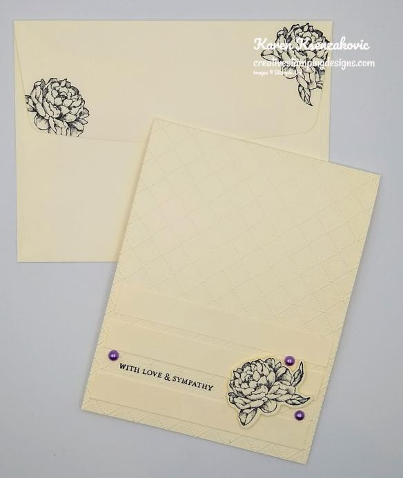 To finish my card I decorated a Very Vanilla Medium Envelope. I stamped the small flower from the Prized Peony stamp set in Tuxedo Black Ink on the bottom of the envelope front and the envelope flap.