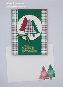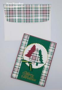 I cut 2 trees from a panel of Whisper White cardstock using the Pine Tree Punch and embossed them using the Wrapped In Texture Embossing Folder. I adhered the trees to the top of the card front using Glue Dots, having them over lap on the score line of the center Granny Apple Green piece. I adhered the card front to a Granny Apple Green card base using Stampin’ Dimensionals.