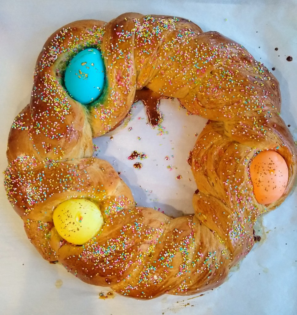 Good Saturday morning my stamping friends and welcome to the weekend. I hope you have some fun plans in the works. I’ll be prepping all day for our Easter brunch tomorrow. I’m looking forward to getting together with my niece and her daughter. Yesterday I made my Easter Egg bread. I started around 7am and didn’t take the last one out of the oven until 7pm. I made 8 loaves that I’ll be sharing with others. My family couldn’t wait to cut into the 1st one out of the oven and I have to admit neither could I. Here’s a picture of the 1st one out which is about 13″-14″ in diameter. They all came out perfect this year, YAY!!!