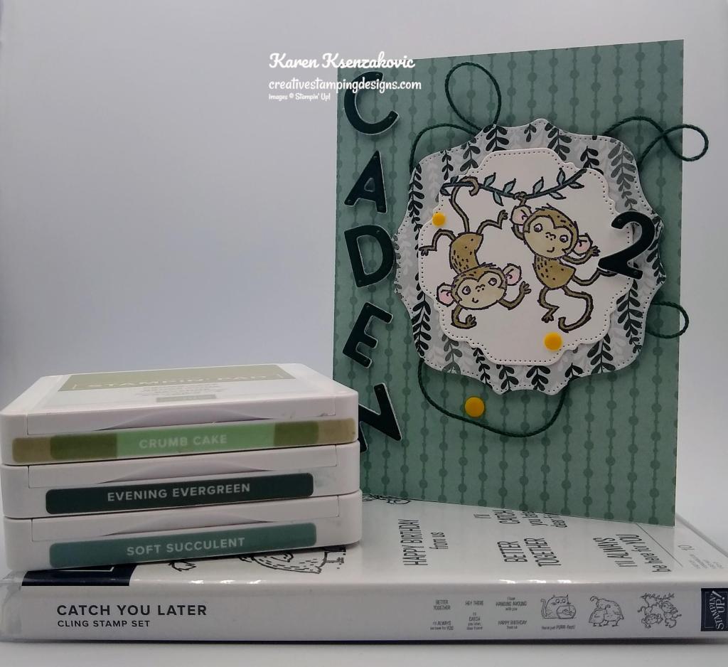 I adhered a panel of In the Wild DSP to the inside of the Soft Succulent card base. On a panel of Basic White cardstock I stamped the monkey image from the Catch You Later stamp set in Tuxedo Black Ink and colored it the same as the card front with my Stampin’ Blends Markers. I stamped the 2 sentiments from the Catch You Later stamp set by the monkey image. From the panel of Evening Evergreen cardstock I cut 2 of the string dies from the Hippo & Friends Dies. I cut 2 of the balloons from the Hippo & Friends Dies from scraps of Daffodil Delight and Real Red cardstock. I adhered the strings to the monkeys hands using Multipurpose Liquid Glue and the balloons to the strings using Stampin’ Dimensionals.