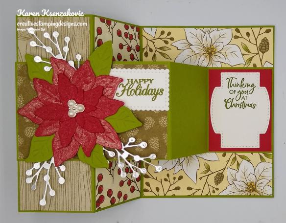 On the inside I stamped the sentiment from the Poinsettia Petals stamp set in Cinnamon Cider Ink on a panel of Very Vanilla cardstock. I had cut 4 of the tiny poinsettias from the Poinsettia Dies from the panel of Cherry Cobbler cardstock. I adhered them together alternating petals using Glue Dots and adhered them on either side of the sentiment using Multipurpose Liquid Glue. I added a Pearl Basic Jewel to the center. I adhered the Very Vanilla panel to a Cherry Cobbler mat and then to the inside of the Thick Very Vanilla card base.