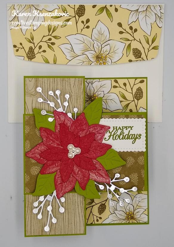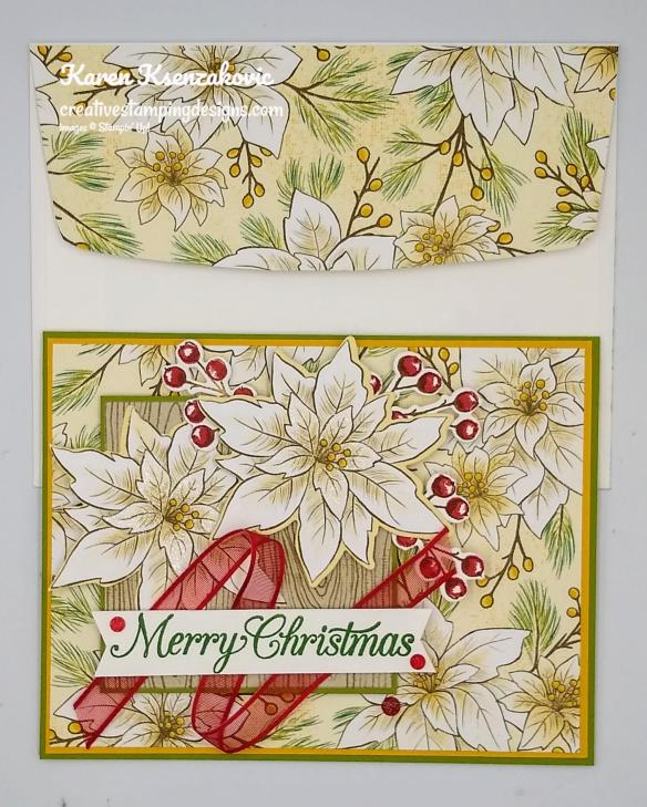To complete my card I decorated a Very Vanilla Medium Envelope. I stamped the poinsettia image from the Poinsettia Petals stamp set in Cherry Cobbler Ink on the envelope front. I adhered a panel of In Good Taste DSP to the envelope flap.
