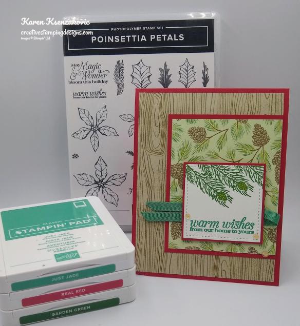 For today’s card I used the Stampin’ Up! Poinsettia Petals Photopolymer Stamp Set, but I didn’t make a poinsettia this time. Here’s my card.