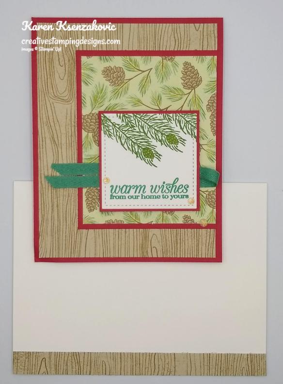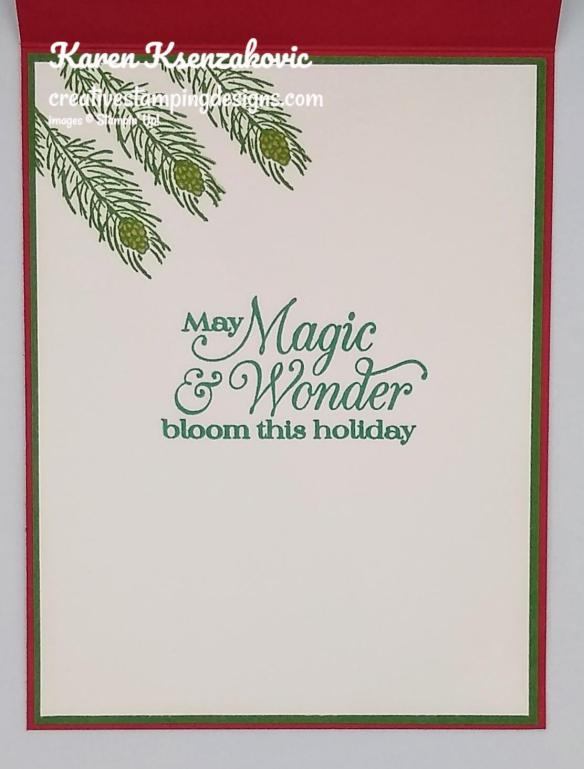 On the inside I stamped the sentiment from the Poinsettia Petals stamp set in Just Jade Ink in the center of a Whisper White panel. I stamped the boughs image from the Poinsettia Petals stamp set in Garden Green Ink on the top of the panel and colored the pine cones in using my Soft Suede Stampin’ Blends Markers. I adhered the Whisper White panel to a Garden Green mat using Stampin’ Seal and then to the inside of the Real Red card base using Multipurpose Liquid Glue.