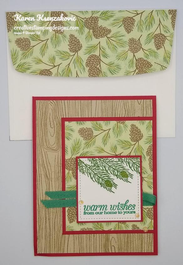 On a panel of Whisper White cardstock, I stamped the sentiment from the Poinsettia Petals stamp set in Just Jade Ink. I stamped the pine bough image from the Poinsettia Petals stamp set in Garden Green Ink above the sentiment. I colored the pine cones in using my Soft Suede Stampin’ Blends Markers. I cut the sentiment out using my Stitched Shapes Dies. I adhered the artwork to a Real Red mat using Stampin’ Seal.